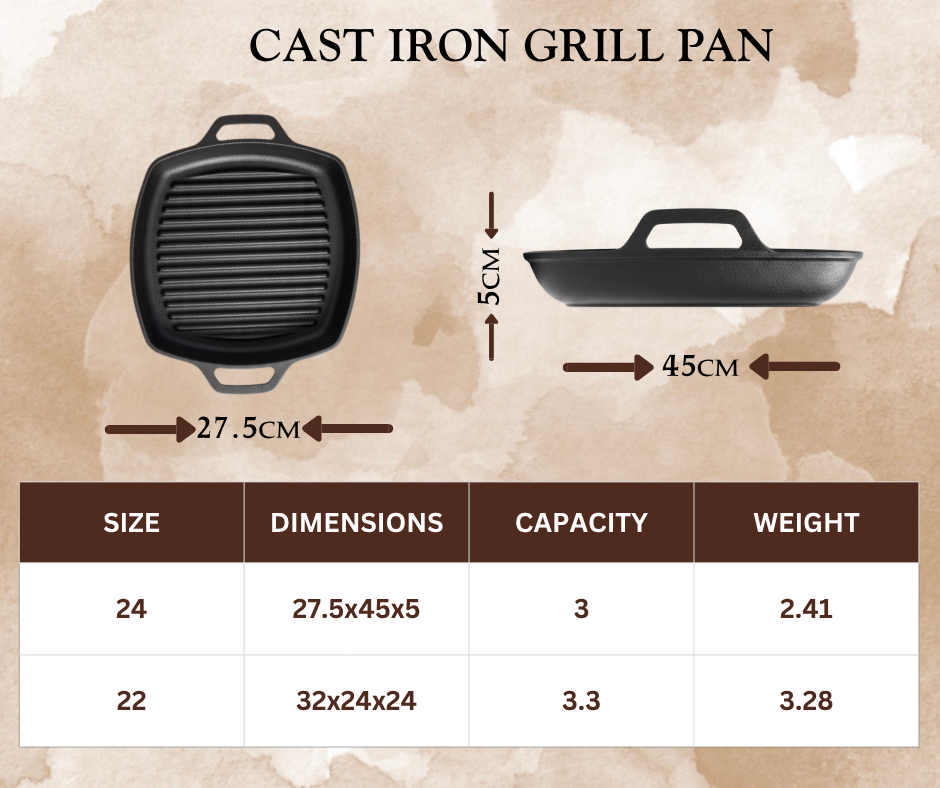Discover the Cast Iron Grill Pan — Designed to bring authentic grill flavors right to your kitchen. Crafted from 100% pure, long-lasting cast iron, it delivers excellent heat retention for those perfect sears and signature grill marks. The pre-seasoned, naturally nonstick surface is completely toxin-free, ensuring healthy, flavorful cooking every time. From juicy steaks to crisp veggies and tender fish, this pan guarantees delicious results and only gets better with every use.