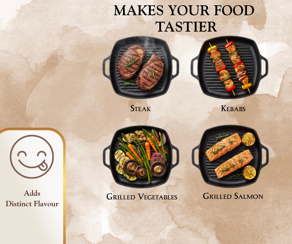 Its pre-seasoned surface provides a natural nonstick finish—free from toxins and synthetic coatings—making it ideal for steaks, veggies, paneer, and seafood. The two-handle design gives you a safe and steady grip, while its compatibility with all cooktops, including induction, makes it a versatile addition to any kitchen.